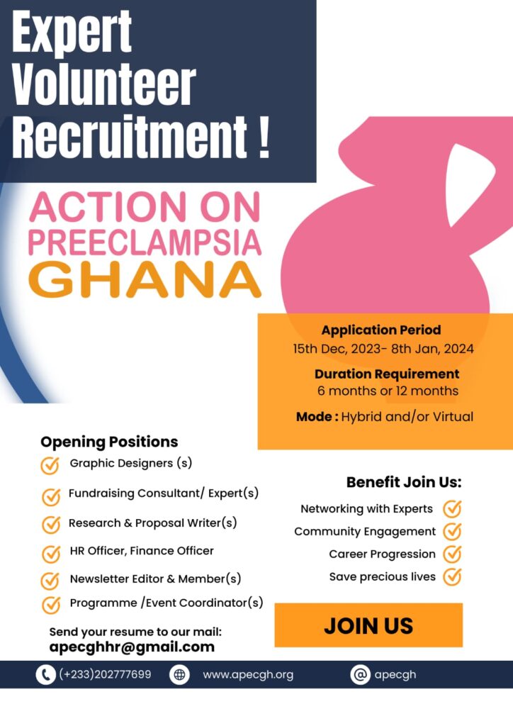 The information contained in this post is for general information purposes only. The information is provided by Expert Recruitment By Pre-eclampsia Association-Ghana: Offer Comes With Benefits and while we endeavour to keep the information up to date and correct, we make no representations or warranties of any kind, express or implied, about the completeness, accuracy, reliability, suitability or availability with respect to the website or the information, products, services, or related graphics contained on the post for any purpose.